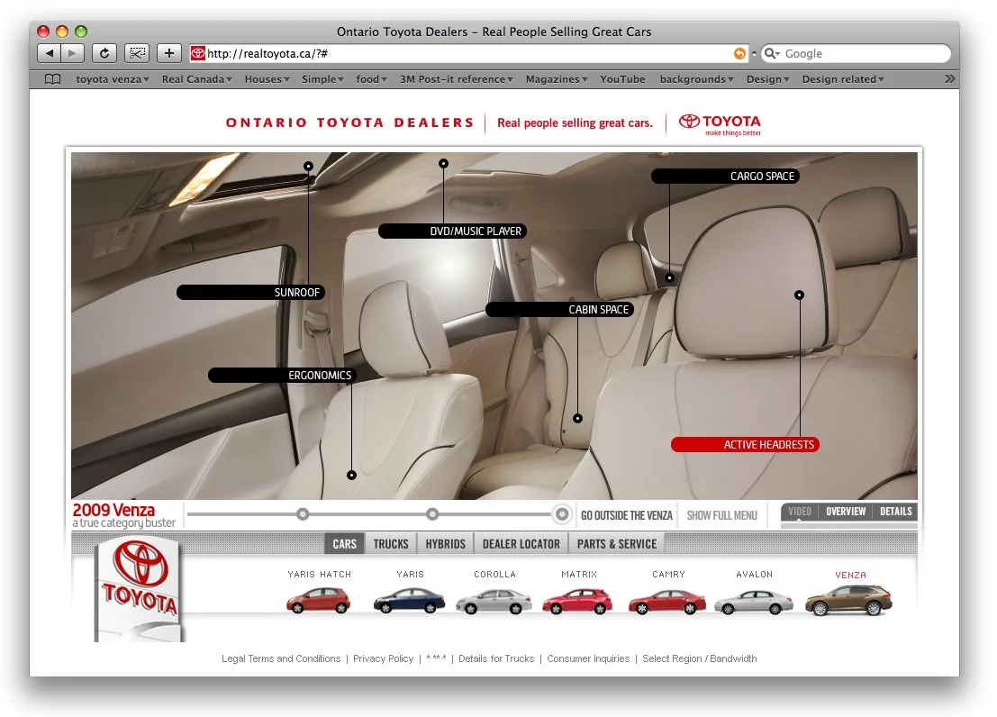 The Ontario Toyota Dealers Association wanted more engaging content on their website than just pictures. It was 2008 and the Internet was just starting to get “bigger pipes”, so video was no longer out off the table. I proposed a series of video walk-arounds for each product Toyota offered, which in turn created on of the most interesting logistical nightmares wrangling some 16 vehicles to set with a union crew and shooting interiors and exteriors in a week. This was followed by a lengthy period of long days in a video editing bay, going over each piece of footage, rendering it down to usable sizes and then converting it to a format for online use.